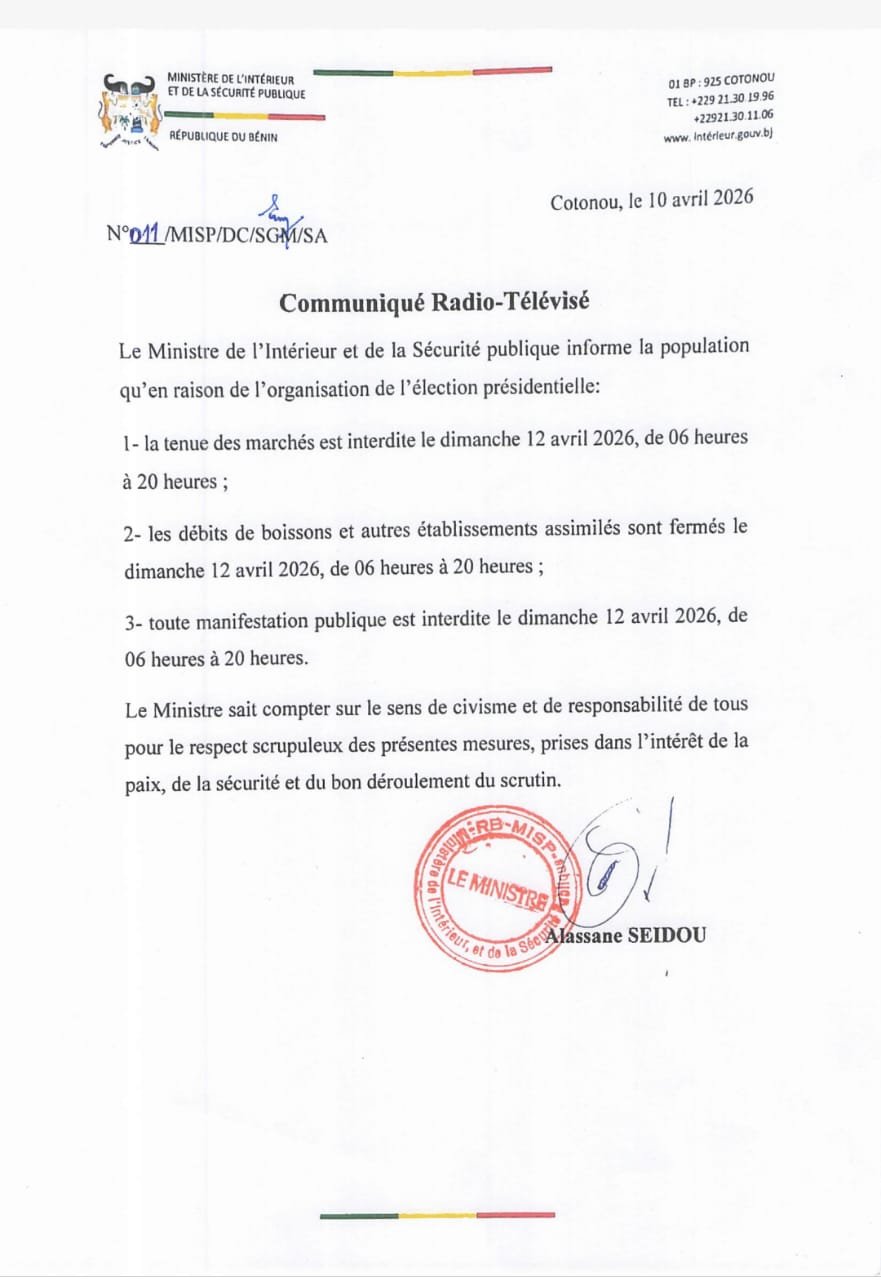 - Élection du dimanche 12 avril 2026 : Le ministre Alassane Seidou interdit les marchés, les débits de boissons et les manifestations publiques
