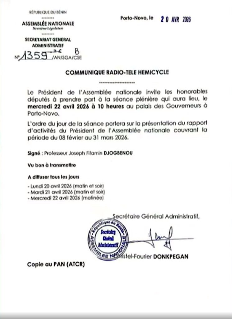 Le Président de l’Assemblée nationale du Bénin a convoqué les députés en séance plénière pour le mercredi 22 avril 2026 au Palais des Gouverneurs à Porto-Novo. Au cœur de cette rencontre parlementaire, la présentation du rapport d’activités du président Joseph Fifamin Djogbénou couvrant la période du 8 février au 31 mars 2026.