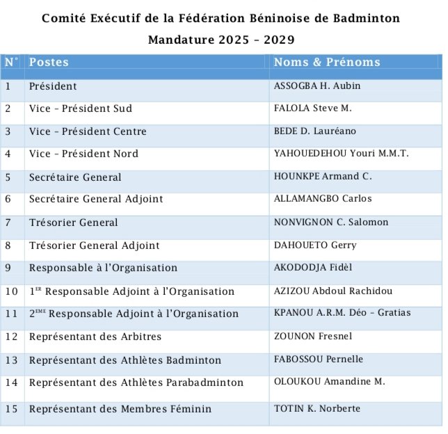 La famille du badminton béninois a tenu, samedi 27 décembre 2025, au siège de la FBBa à Arconville, Abomey-Calavi, son assemblée générale élective. Au cours de ce rendez-vous qui intervient après quatre années de gestion, les délégués des clubs ont passé au peigne fin les rapports et ont élu le nouveau bureau du comité exécutif. Ledit bureau est conduit par Aubin Assogba, qui conserve ainsi son rôle de leader et de première autorité de ce sport au Bénin.