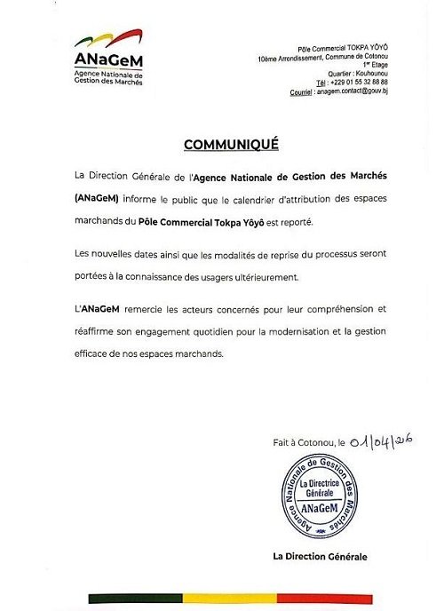 Dans un communiqué rendu public ce mercredi 1er avril 2026, l’Agence nationale de gestion des marchés (ANaGeM) a annoncé le report du processus d’attribution des places dans le nouveau marché Tokpa Yoyo situé à l’esplanade du Stade Mathieu Kérékou. Ce report fait suite à de nombreux cris des commerçantes de Dantokpa qui affirment n’avoir pas trouvé de place dans le nouveau marché. Ce sont essentiellement des sous-locataires qui ne traitent pas directement avec la SOGEMA. Parallèlement, l’ANaGeM entame aujourd’hui et jusqu’au 06 avril 2026 un processus de recensement des exploitants et sous-locataires du marché Dantokpa. Ce recensement a lieu au Pôle Commercial Tokpa Yôyô et pourrait déboucher sur une solution à la situation des nombreuses femmes n’ayant pas trouvé de place dans le nouveau marché. Mais il pourrait bouleverser le calendrier de déplacement du marché Dantokpa. La mise en service officielle de la galerie marchande Tokpa Yoyo était prévue pour le 09 mai, et le 16 mai 2026 était la date retenue pour l’entrée en exploitation de « Tokpa Daho », le grand marché de gros d’Akassato (Abomey-Calavi).