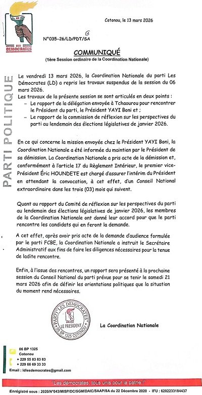 Ouverture au dialogue politique :  La session de la coordination nationale a également été l’occasion d’évoquer la stratégie politique du parti dans un contexte de recomposition des alliances au sein de l’opposition. À ce titre, les responsables des Démocrates ont indiqué avoir reçu une demande d’audience du parti Force Cauris pour un Bénin Émergent (Fcbe), demande qui a été acceptée. Les discussions à venir pourraient ainsi ouvrir la voie à de nouvelles dynamiques de coopération entre formations politiques de l’opposition.