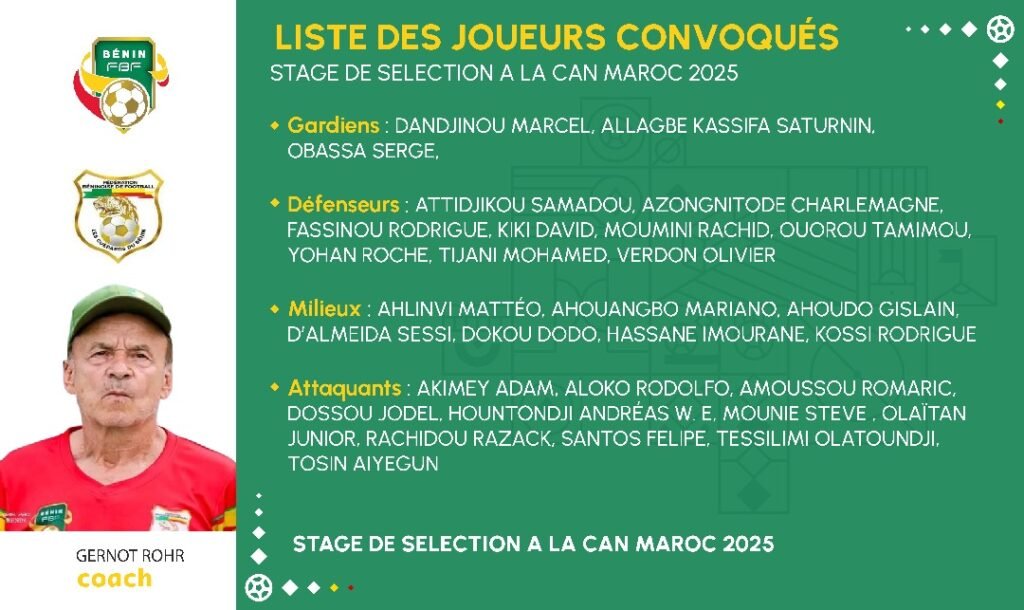 Dans exactement 16 jours, la plus grande compétition de la confédération africaine de football (CAF) va prendre son envol au Maroc. Sur cette dernière ligne droite, le sélectionneur des Guépards, Gernot Rohr a convié 30 joueurs béninois à un stage de préparation. Ledit stage qui vient avant l’annonce de la liste définitive du Bénin pour la CAN aura lieu à Benslimane, au Maroc, à partir du 10 décembre en vue de la CAN. Ainsi, après quelques jours de travail, l’équipe rejoindra Rabat, pour démarrer la compétition. Là, elle disputera deux matchs, d’abord contre la République démocratique du Congo puis contre le Botswana dans le cadre de la phase finale de la CAN.Ensuite, elle prendra la direction de Tanger où, elle jouera son dernier match de poule face Sénégal.A souligner que la liste définitive des 28 Guépards du Bénin retenus pour la CAN sera rendue public le 11 décembre à minuit.