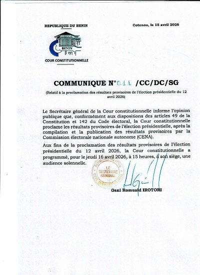 A travers un communiqué en date du 15 avril 2026, le secrétaire général de la Cour constitutionnelle, Gani Romuald Irotoni, a annoncé que la haute juridiction procédera ce jeudi à la proclamation des résultats provisoires de la présidentielle 2026, tenue le dimanche 12 avril dernier. Et ceci, après la compilation et la proclamation des résultats provisoires du même scrutin présidentiel par la Commission électorale nationale autonome (Cena).