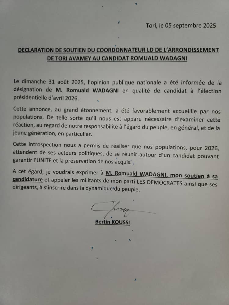 Après le député Léon Basile Ahossi, un autre responsable à la base du parti Les Démocrates appelle à soutenir la candidature de Romuald Wadagni, récemment choisie par la mouvance au pouvoir pour la course à la présidentielle 2026. Il a pour nom, Bertin KOUSSI, Coordonnateur du parti Les Démocrates de l’arrondissement de Tori-Avamey. Lire ci après l’intégralité de sa déclaration en date du vendredi 05 septembre 2025.