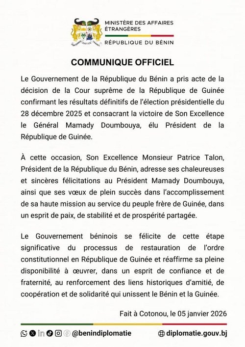 Le Bénin a officiellement réagi à l’élection de Mamady Doumbouya à la magistrature suprême en Guinée. Dans un communiqué en date du lundi 5 janvier 2026, le gouvernement béninois a indiqué avoir pris acte de la décision de la Cour suprême de la République de Guinée confirmant les résultats définitifs de l’élection présidentielle organisée le 28 décembre 2025. Ces résultats consacrent la victoire du Général Mamady Doumbouya, désormais élu Président de la République de Guinée.