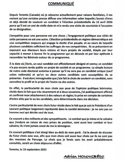 L’ancien président de l’Assemblée nationale et leader politique, Adrien Houngbédji, a réagi depuis le Canada aux rumeurs selon lesquelles, il aurait déjà décidé de soutenir un candidat à l’élection présidentielle du 12 avril 2026.