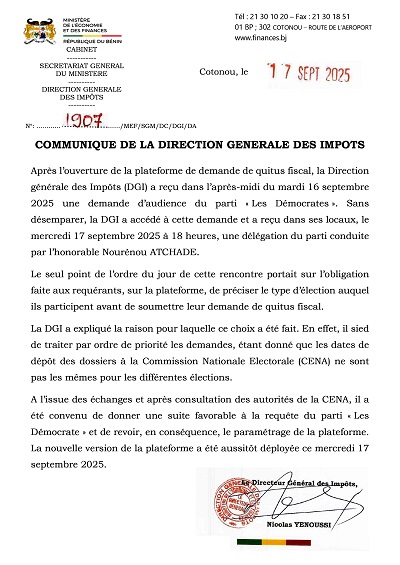 À la suite d’une rencontre avec une délégation du parti « Les Démocrates », la Direction générale des Impôts (DGI) a procédé, le mercredi 17 septembre 2025, à une mise à jour de sa plateforme de demande de Quitus fiscal.