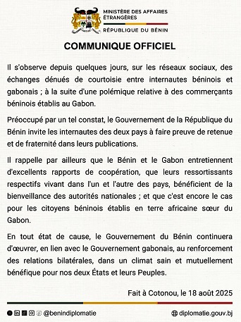 Le ministère des Affaires étrangères du Bénin a publié un communiqué officiel le 18 août 2025, exhortant les internautes béninois et gabonais à faire preuve de retenue suite à des échanges tendus en ligne. Le gouvernement réaffirme son engagement à renforcer les relations bilatérales avec le Gabon dans un climat de coopération et de bienveillance mutuelle. Cette mise au point intervient après un premier communiqué dans lequel le gouvernement béninois annonçait la semaine dernière son intention d’envoyer une mission au Gabon pour évaluer ma situation des Béninois face à la crise provoquée par des tensions xénophobes au marché de Lambaréné.