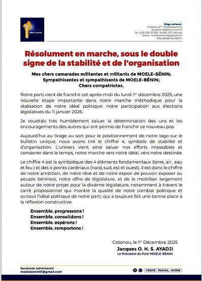 Le parti MOELE-BÉNIN a franchi une étape décisive dans sa préparation pour les élections législatives prévues le 11 janvier 2026. Ce lundi 1er décembre 2025, le parti a reçu son récépissé définitif de la Commission Électorale Nationale Autonome (Céna) et a participé au tirage au sort déterminant le positionnement des logos sur le bulletin unique. À cette occasion, le président de MOELE-BÉNIN, Jacques O.H.S. Ayadji, a annoncé que le parti occupera la quatrième position sur le bulletin, un chiffre qu’il a qualifié de symbole de « stabilité et d’organisation ».
