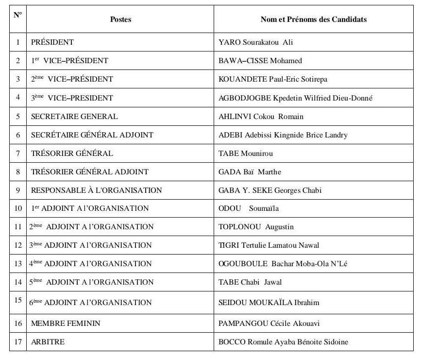 Cette équipe du président Ali Yaro a connu quelques réajustements ainsi que des arrivées en vue de relever encore plus efficacement les défis qui attendent la fédération. Parlant des entrées, il s’agit des hommes et femme qui, depuis leur position, apportaient déjà leur pierre à l’édifice. On a ainsi Brice Adébi, président de la Ligue Atlantique-Littoral qui entre dans le bureau au poste de secrétaire général adjoint (SGA). Il remplace Arouna Soulé, admis à la direction technique du volley-ball. Au niveau de l’organisation, Bachar Ogueboulé et Ibrahim Seidou Moukaila ont pris les postes d’adjoints. Cécile Akouavi Pampangou, elle est élue membre féminin.